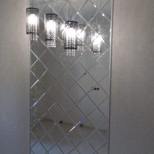 Использована квадратная серебристая зеркальная плитка размером 18х18.